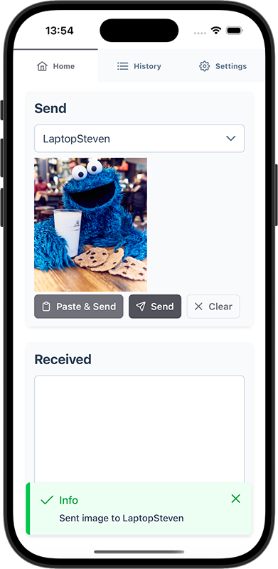 Yes, you can send images between devices. Just copy the image and paste it in the app. The image will be sent to the other device where you can save it.